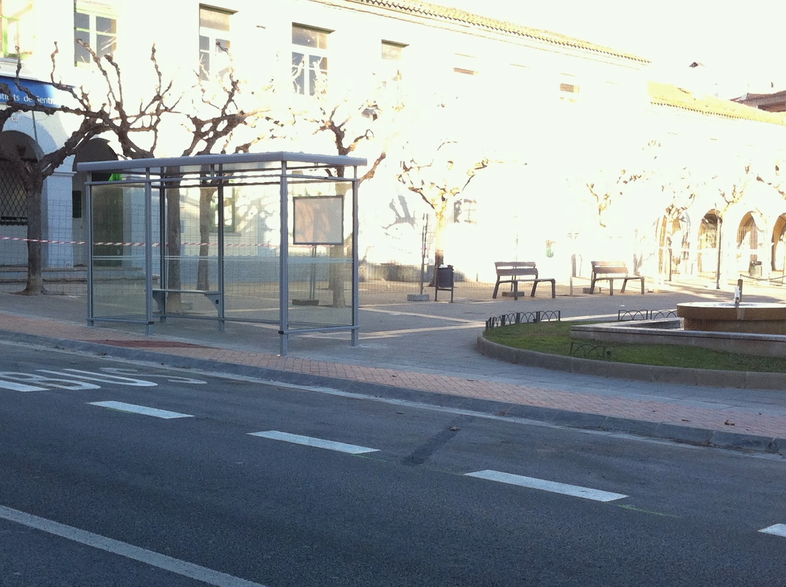 Ja està instal·lada la marquesina de la parada de l'autobús a la nova ubicació, davant de la Plaça de la Vila, després dels treballs de reurbanització del tram est de la vorera de l'Av. Anselm Clavé.